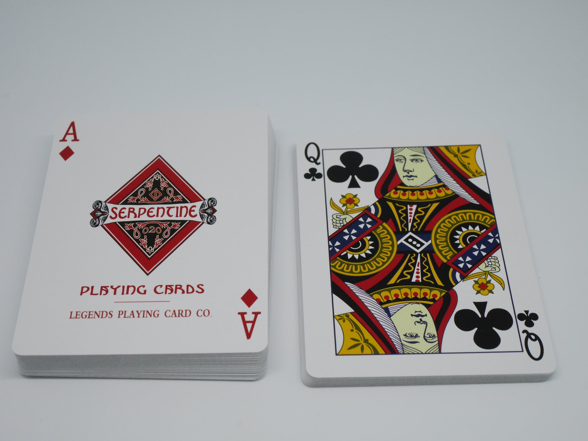Introducing Serpentine, a new classically themed line of playing cards from LPCC. We discovered a 100+ year-old pinochle deck at The World of Playing Cards and fell in love with the classic back artwork and gorgeous faces. With help from collector and playing card lover Ken Lodge, we tracked down the original artwork. Our artists re-worked the back design and converted all the files so they were print-ready, as well as adding special touches like new pips and a custom Ace and Joker illustrated by Stuart Palm.