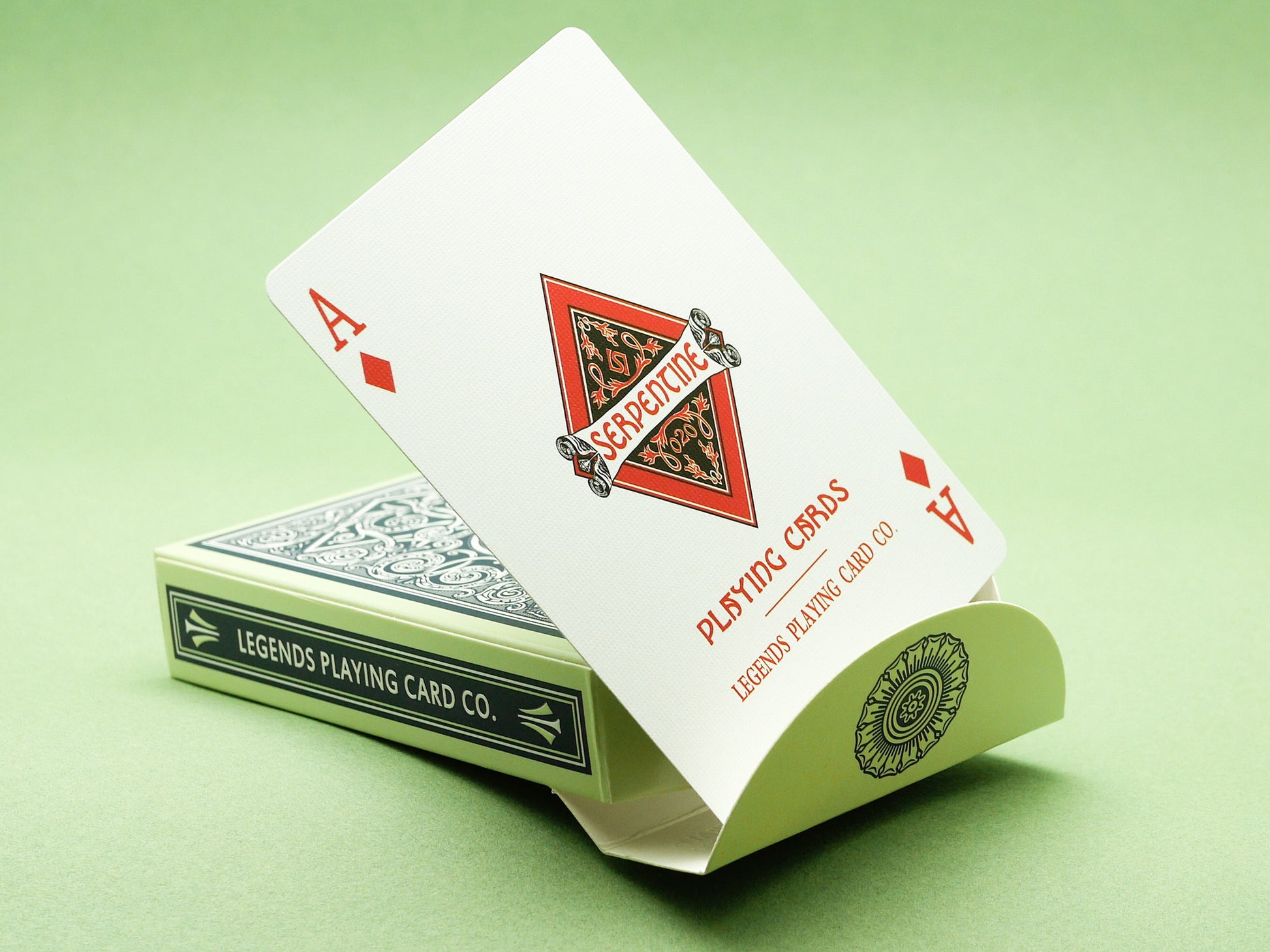 At LPCC we are always experimenting with new production methods, printing, and packaging. We printed Serpentine at a new factory, on traditionally cut European card stock, with precise printing registration. Though the cards don't have the exact same buttery smooth edges as our 'Diamond Cut' decks printed in Taiwan, the cards faro extremely well, and our new Emerald Finish has a great snap and feel in-between our stiffer Diamond Finish and softer Classic Finish. The cards have more of a "papery" feeling to them than Diamond Finish, yet are still durable and resist warping in humid or arid climates. In short, a fantastic handling deck at a competitive price point.