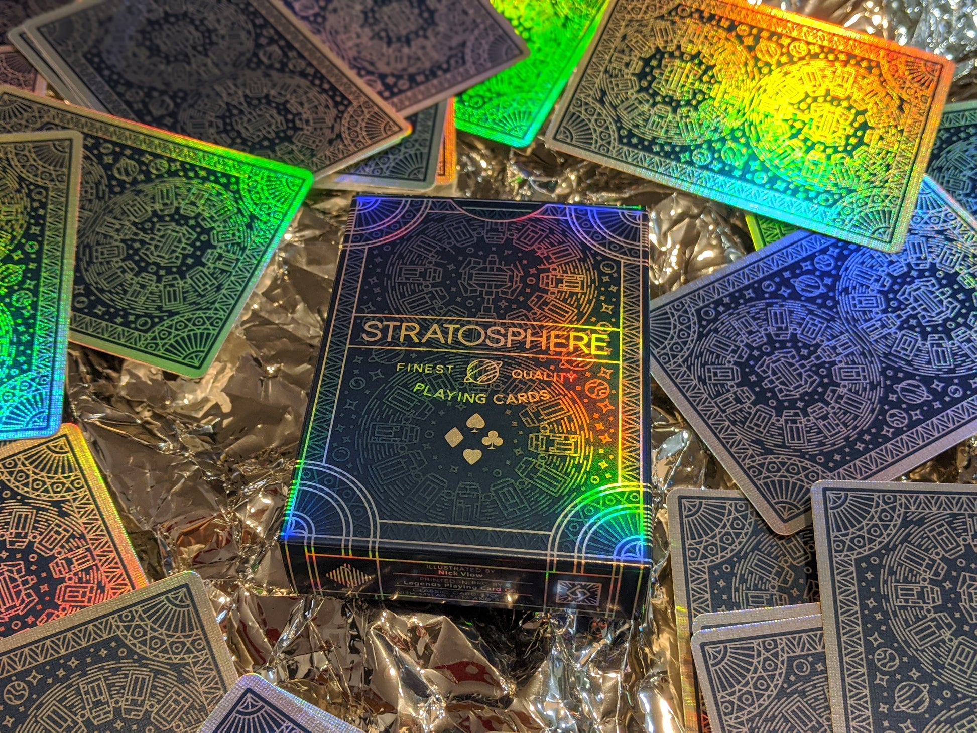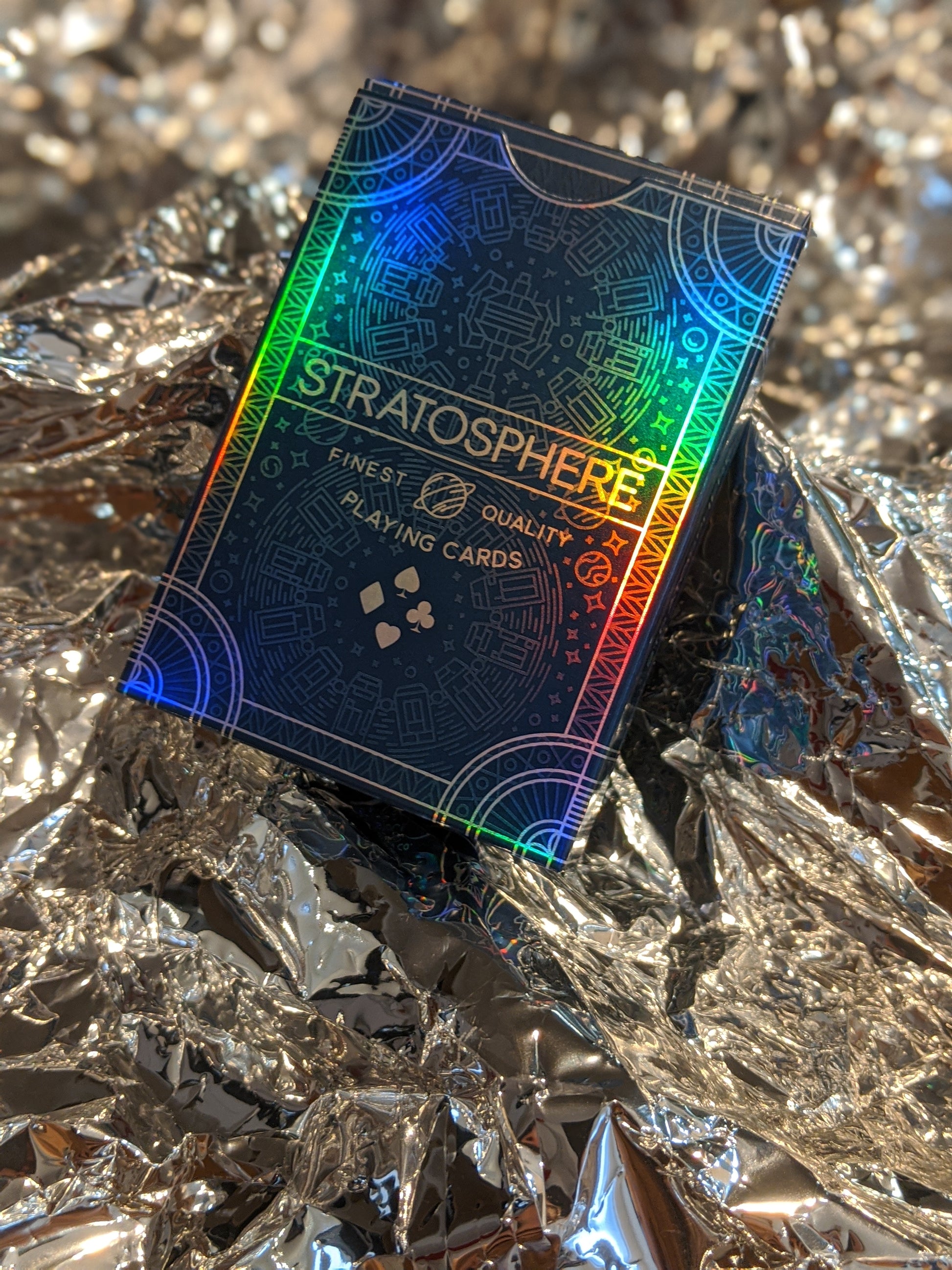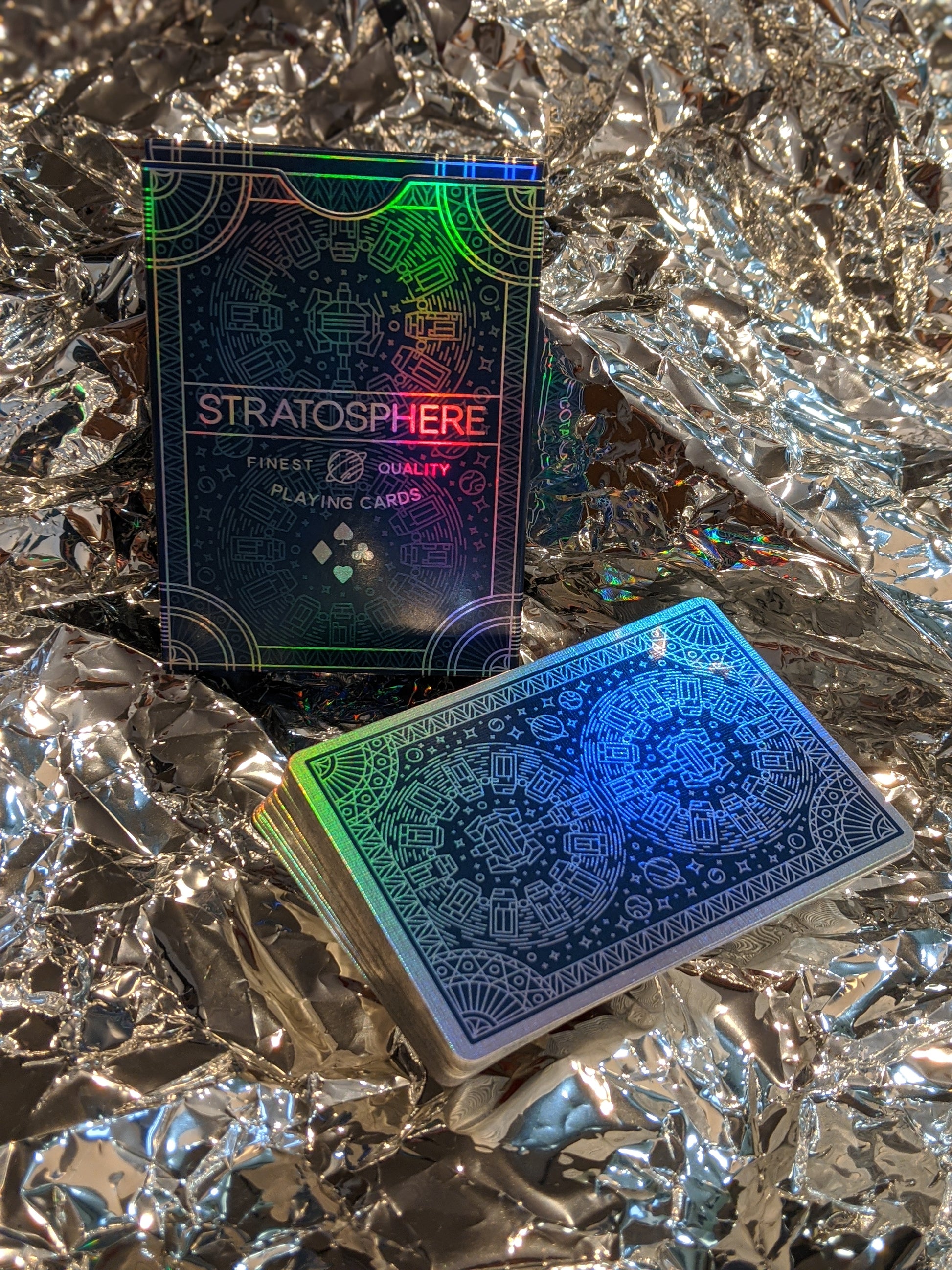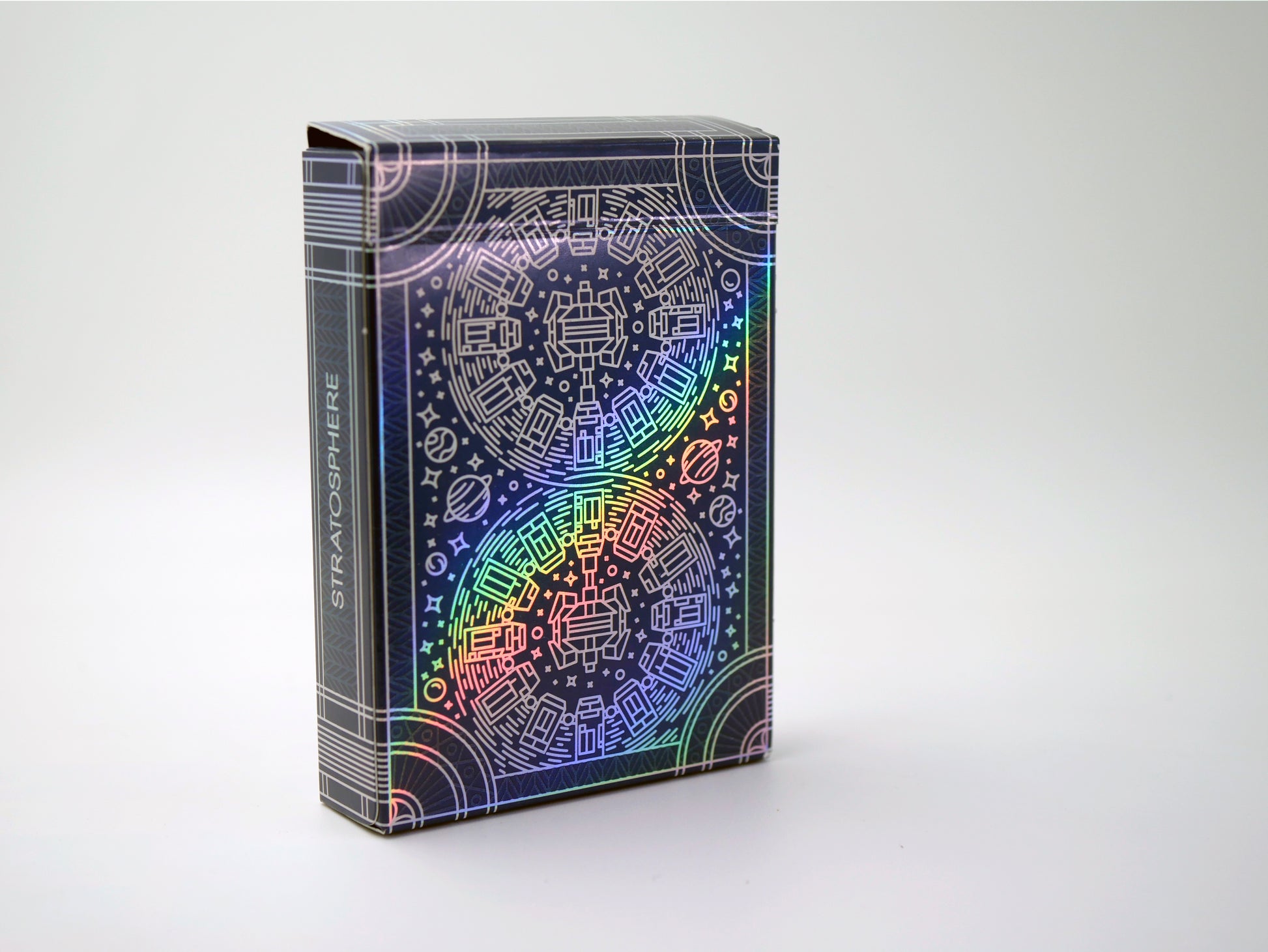 For designers as excited as we are about this process, you can even print white onto this material, under the colored inks, in order to block out certain shiny elements of your artwork! In this case of the Stratosphere deck, we printed a deep space blue color that fits with the theme, allowing the holographic solar-sail material to shine around those lines in full intergalactic glory. From famed and exclusive card designer Nick Vlow, looking at Stratosphere cards is like staring into the depths of the Milky Way.