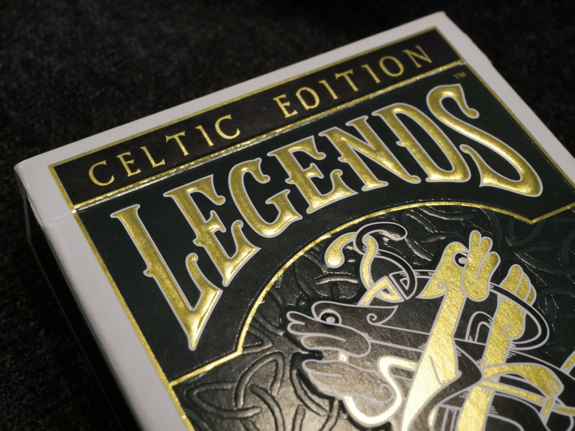 Stuart Palm's custom artwork, LOBA treated, Pre-Crushed Master Finish card stock, and a Cold Foil tuck box with multi-level embossing is what are are showcasing for the #353 Celtic Edition. Cold foil rolls onto the tuck just like an imprint ink, it is perfectly registered and doesn't have any noticeable shift which can occur when hot stamping foil onto a tuck box or playing card sheet. The cards are a bit clumpy feeling out of the box, and not super smooth like Classic Finish, however they break in well and stay stiff and usable for longer.