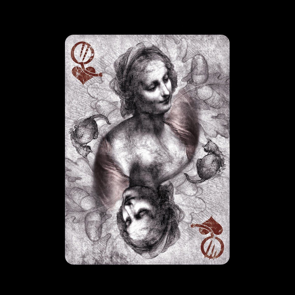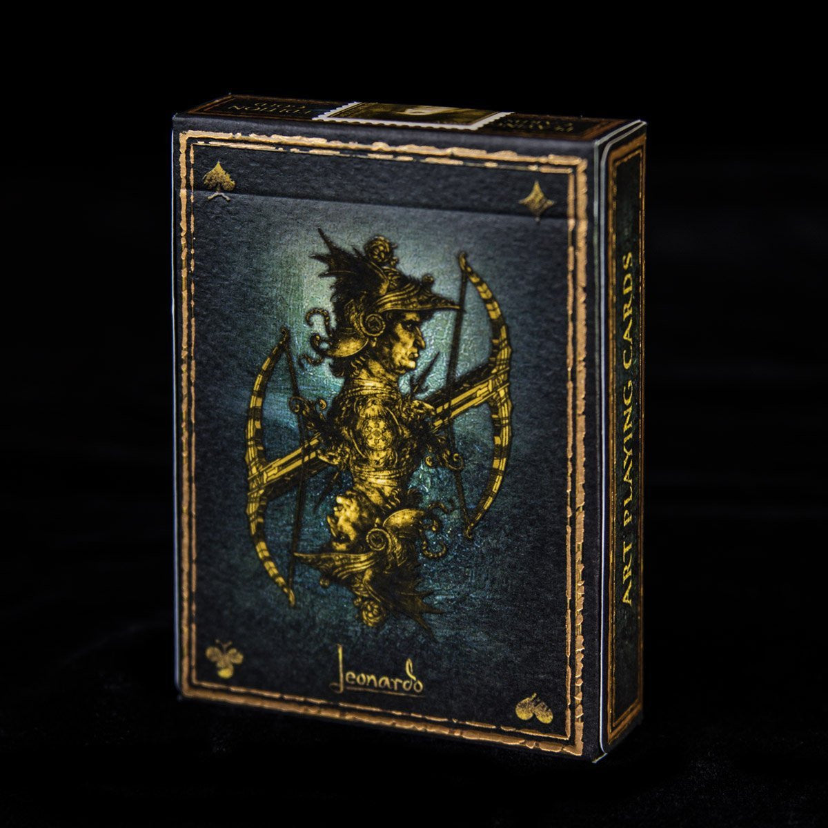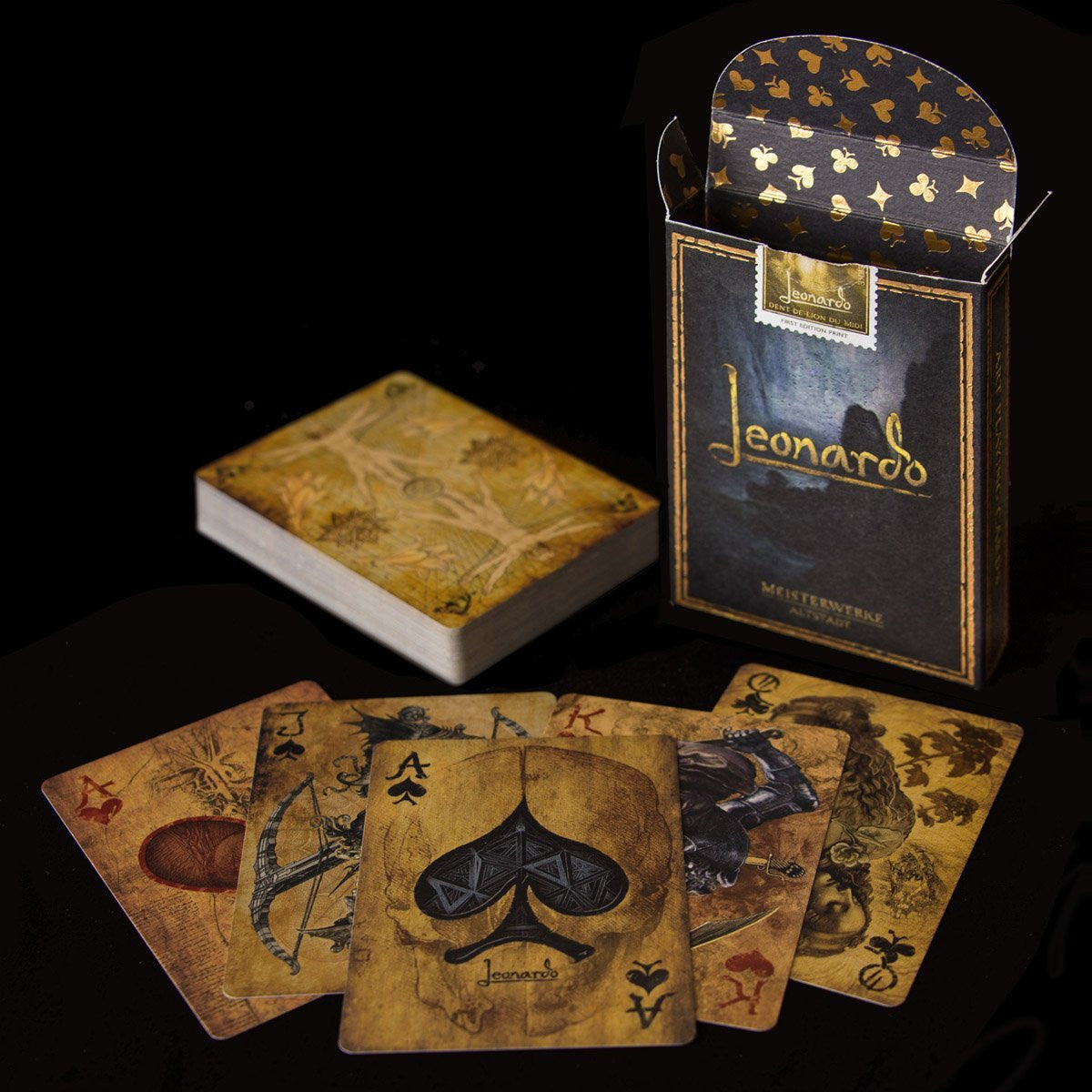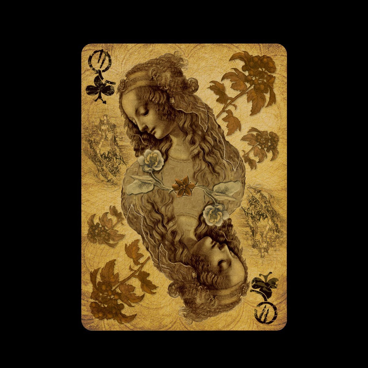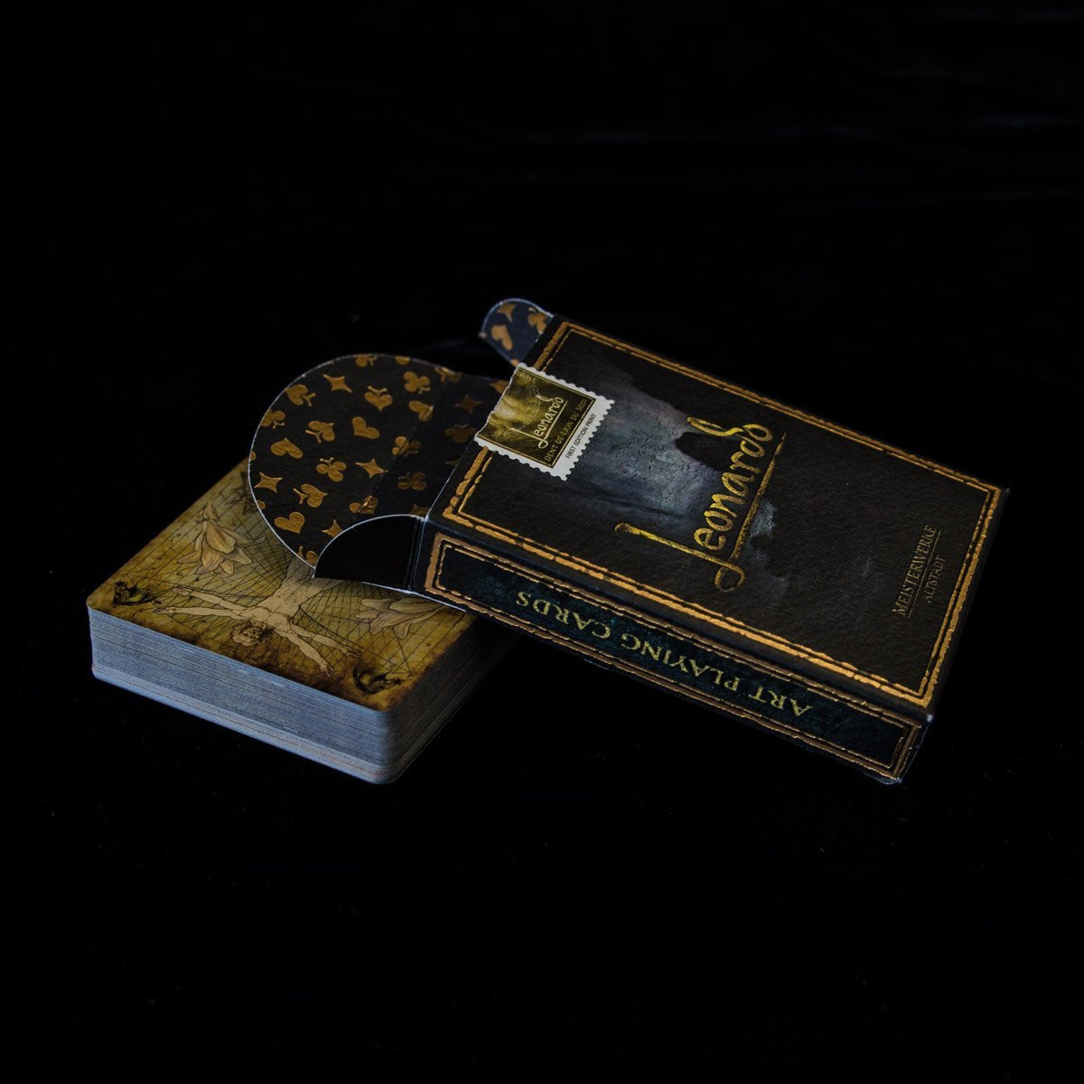 - Exterior matte hot stamped foil with Spot UV varnish over the top, simulating an art style of Leonardo's time period using egg whites