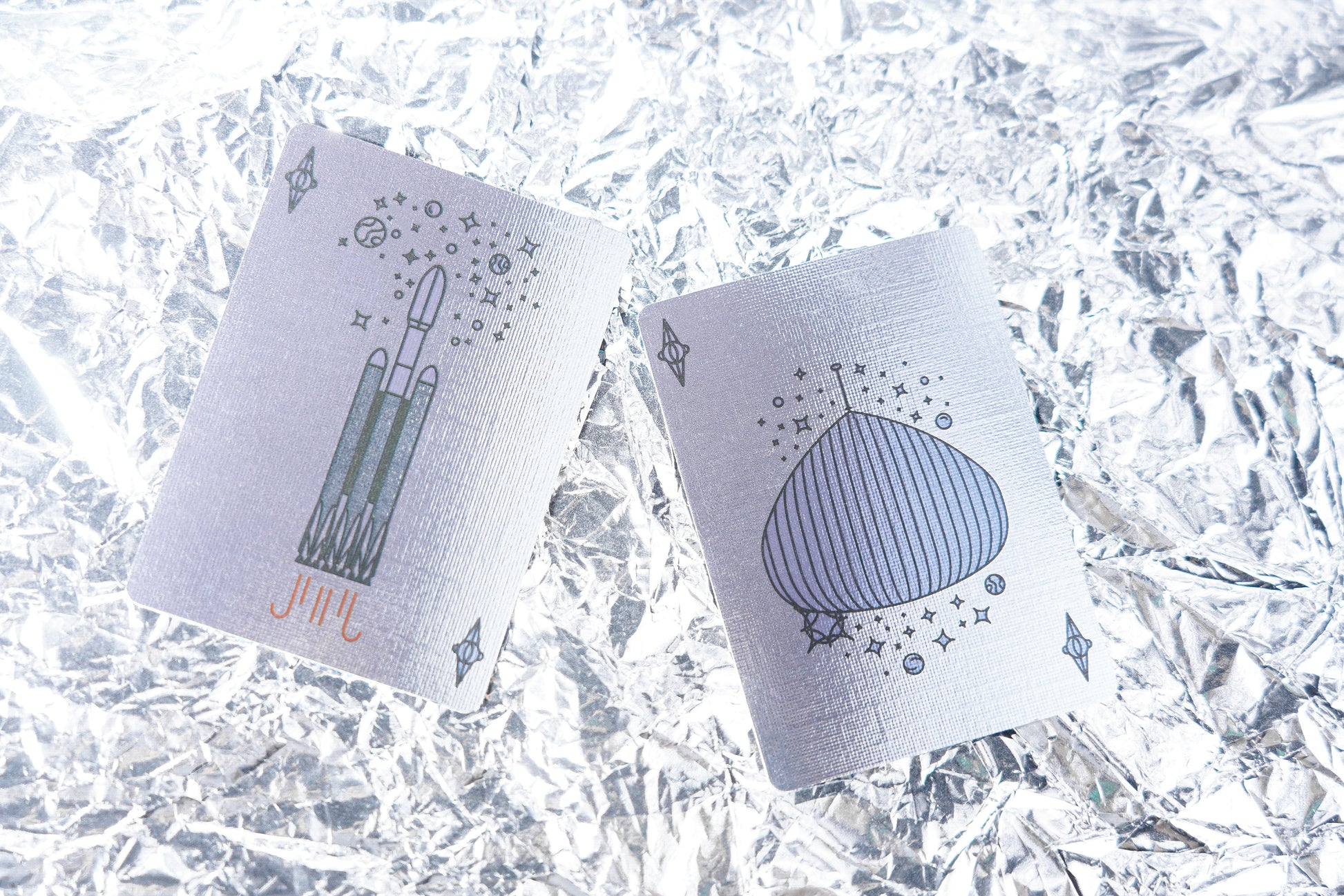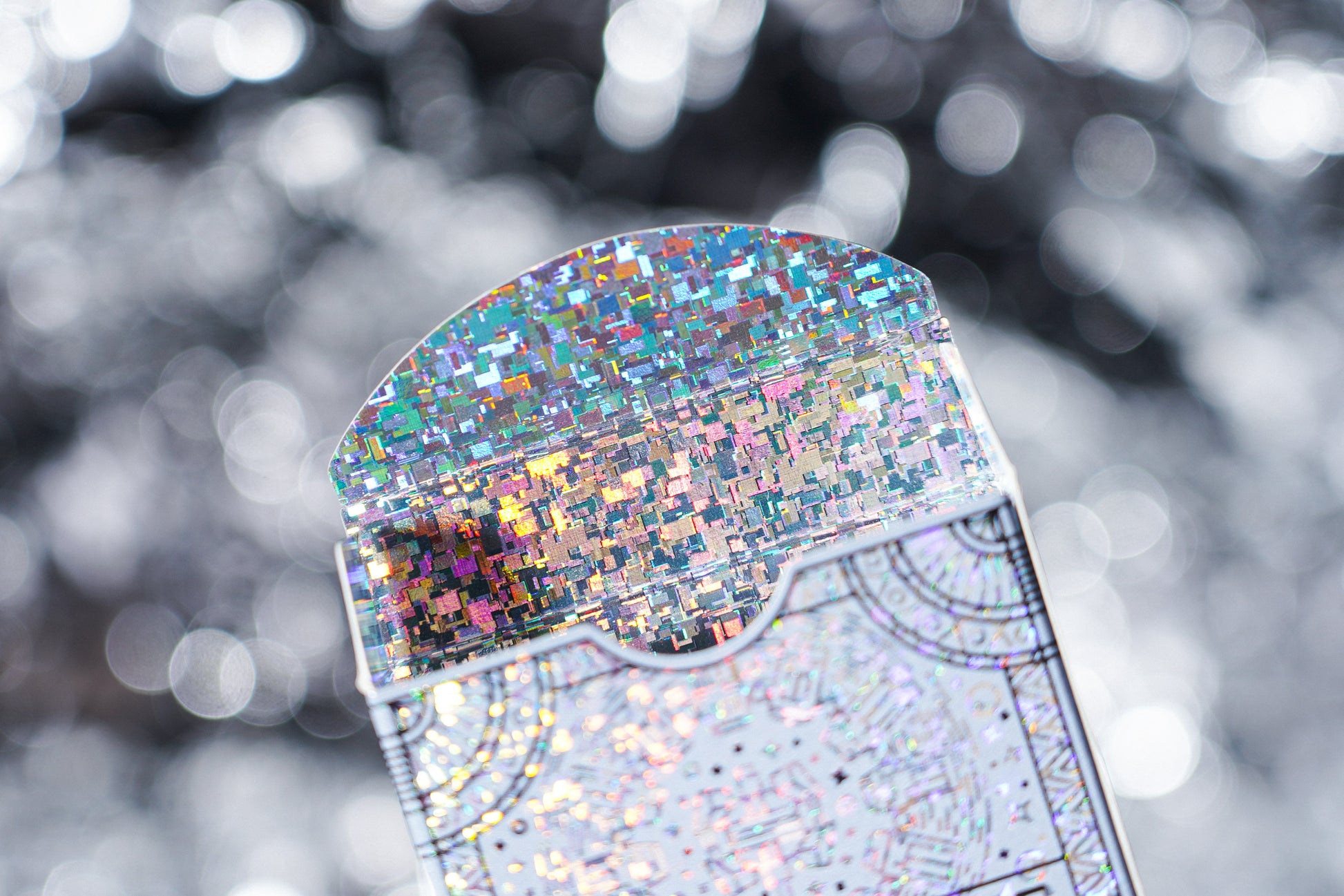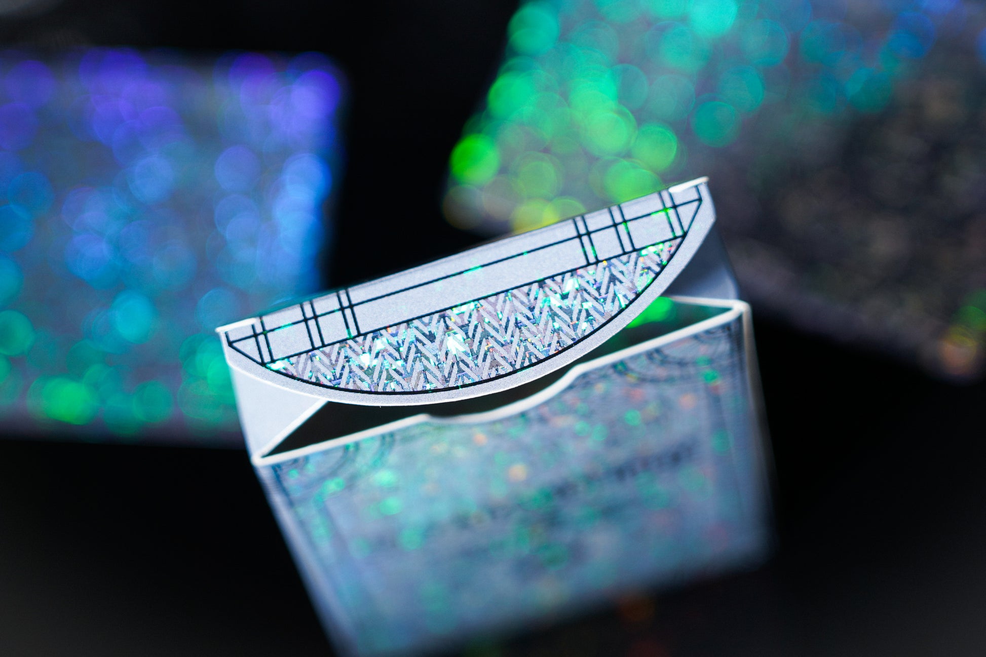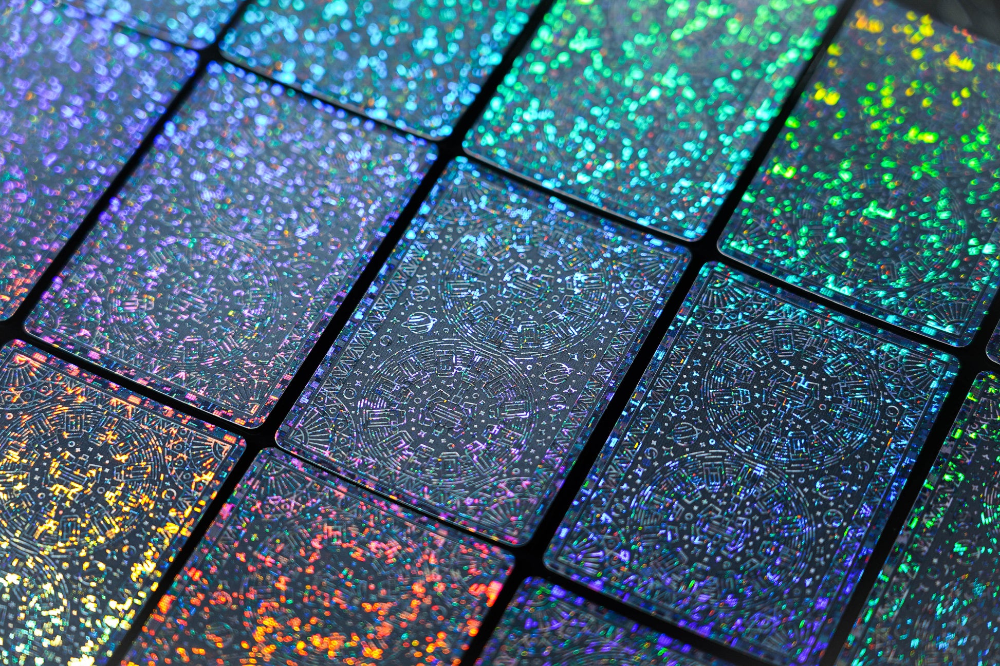 As for the playing cards, we use an ultra-thin mylar, or full foil, laminated to thin paper on both sides. The card backs are a holographic full foil pattern, giving these decks an otherworldly shimmer, and the faces are standard silver mylar. Like rare Pokemon cards, the faces and backs feature overprinting at varying opacities to block out the shiny effects of the full foil. The only difference between these and trading cards is our decks spring, fan, and handle like a normal deck of playing cards! A designer's dream, and totally out-of-this-world technology for future playing card decks like the Fontaine Characters or Haas Brothers x L'Objet colloboration.