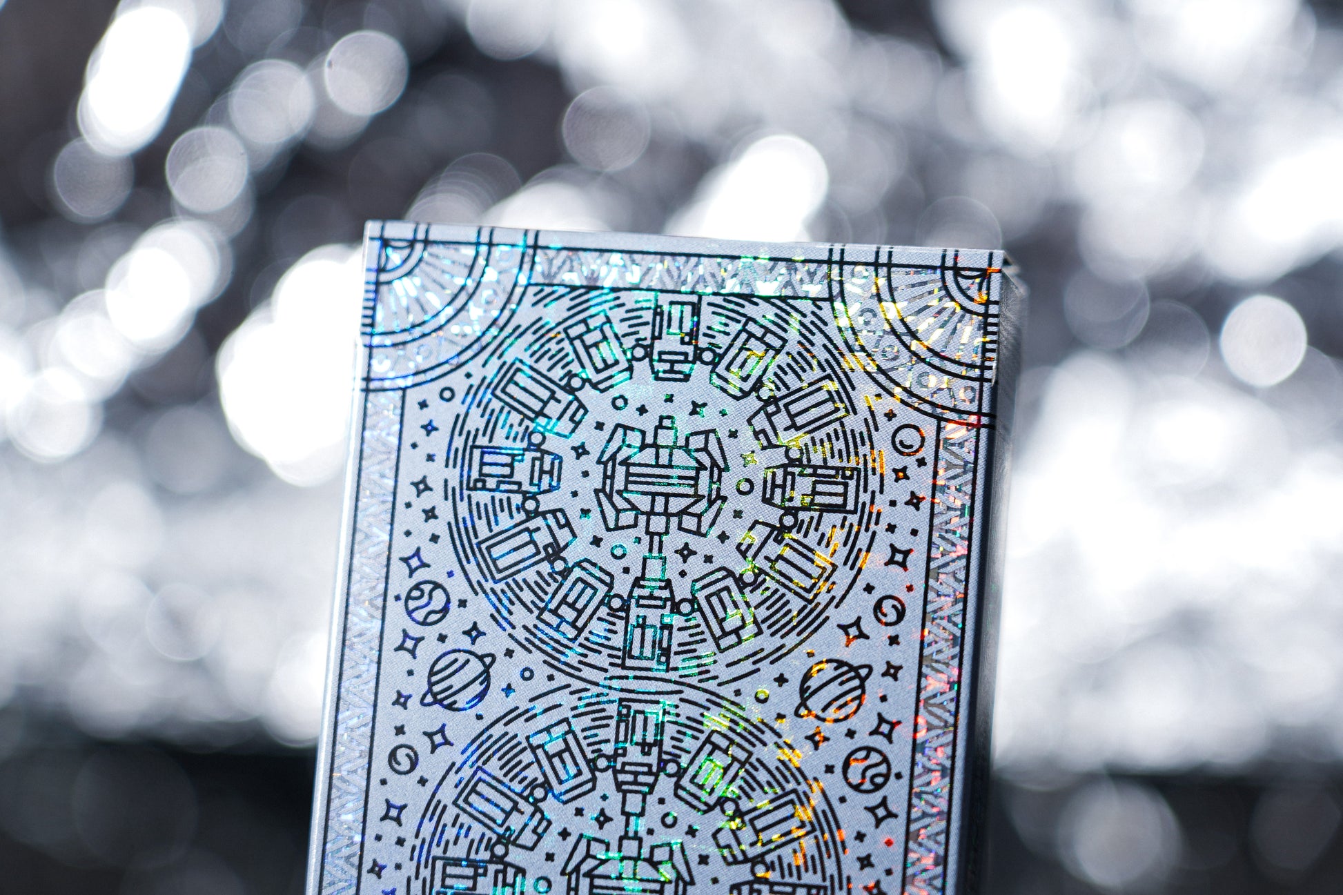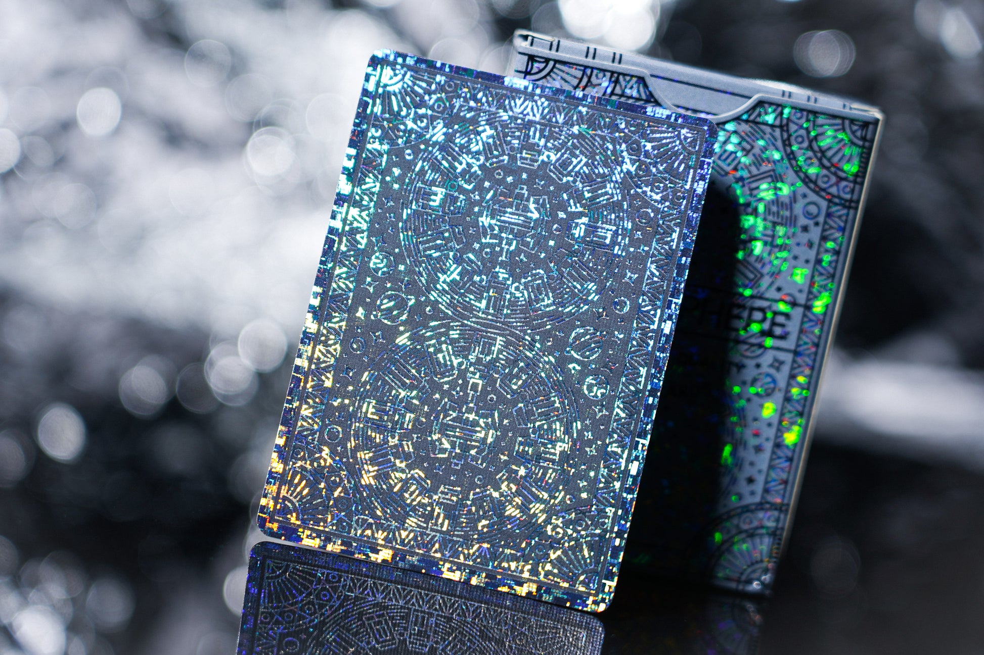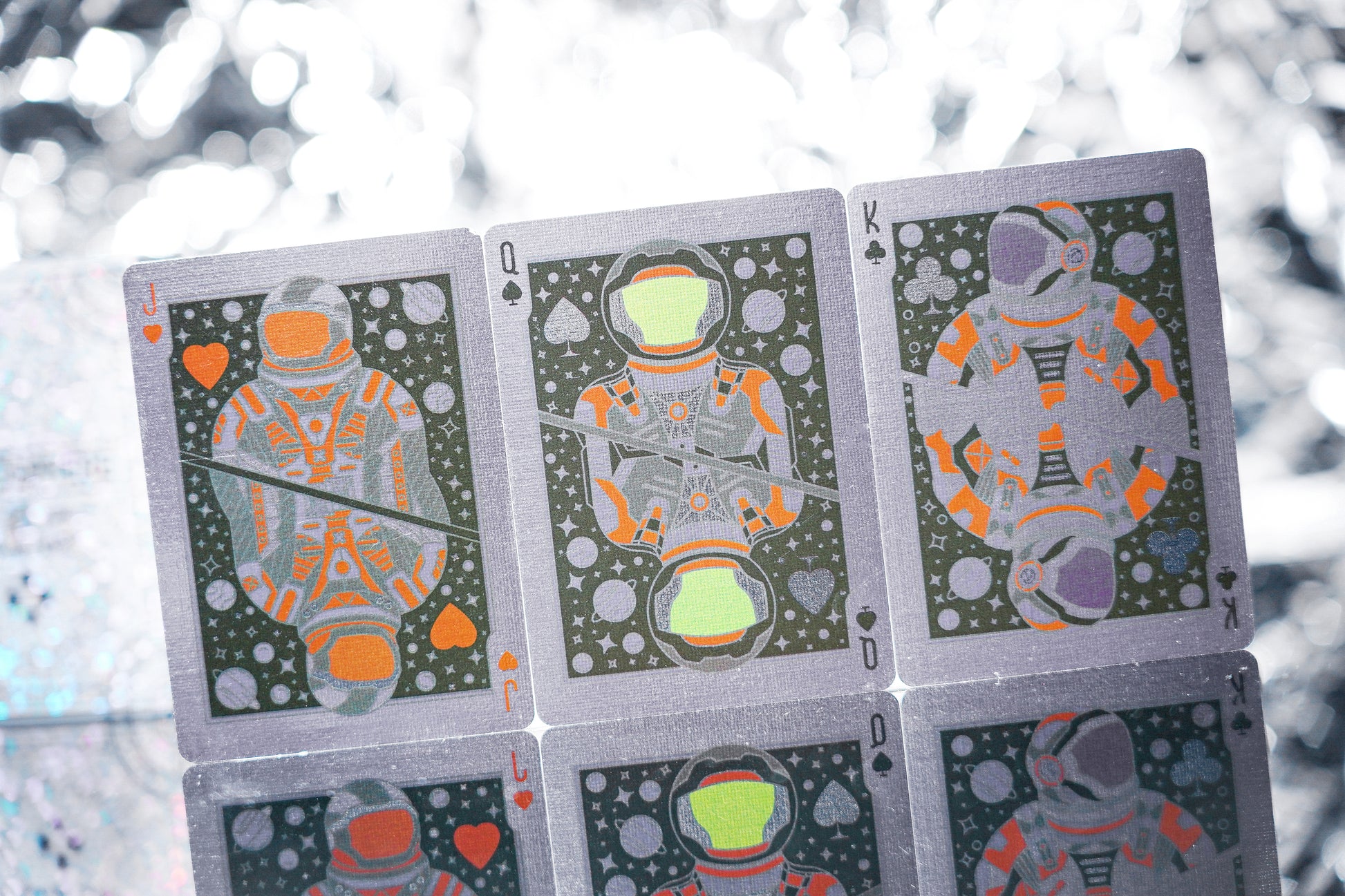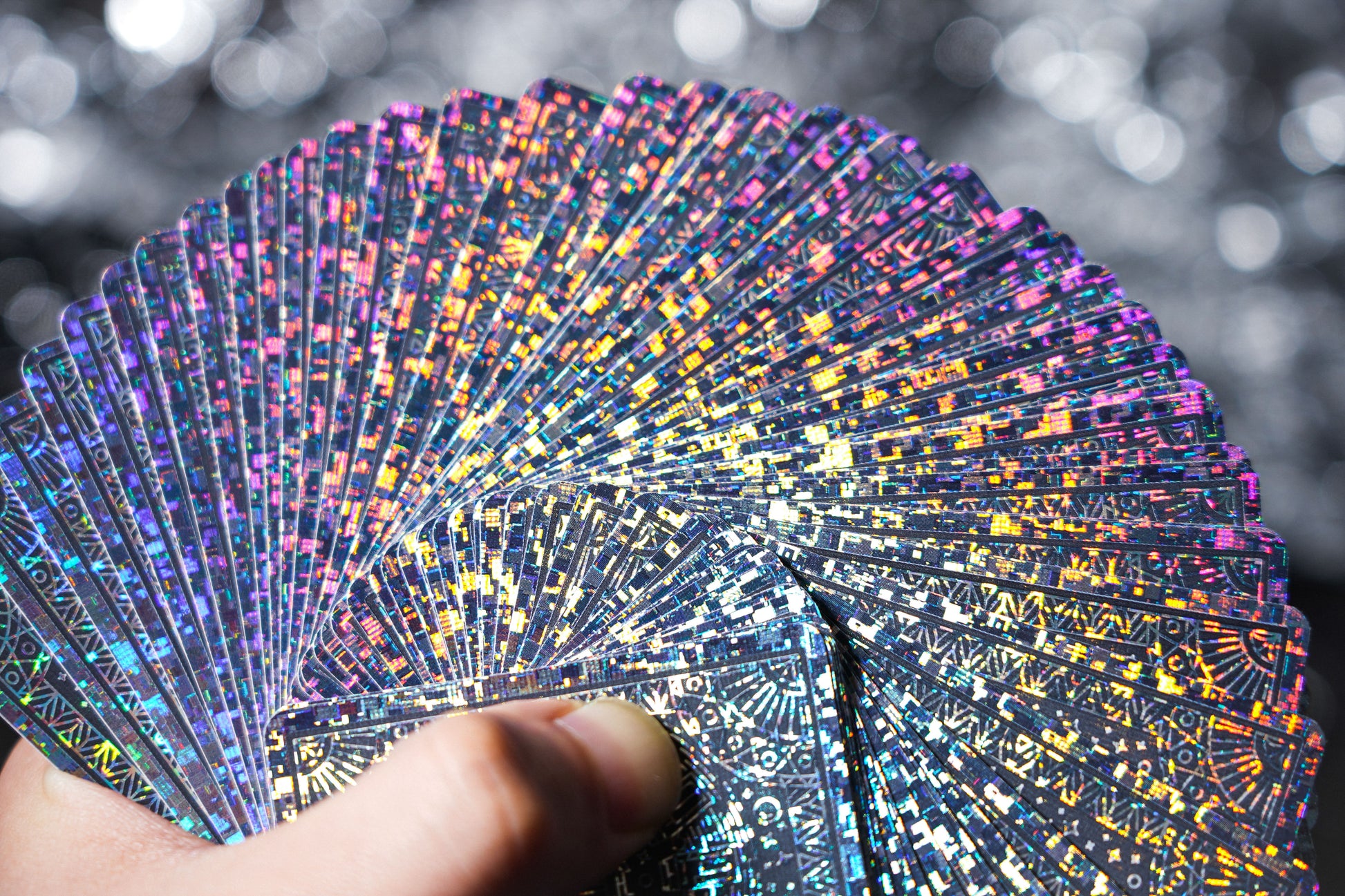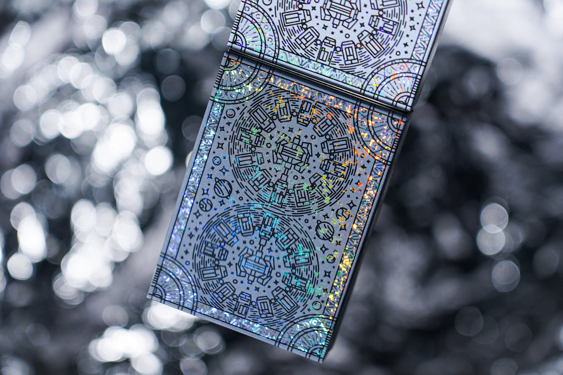 As for the playing cards, we use an ultra-thin mylar, or full foil, laminated to thin paper on both sides. The card backs are a holographic full foil pattern, giving these decks an otherworldly shimmer, and the faces are standard silver mylar. Like rare Pokemon cards, the faces and backs feature overprinting at varying opacities to block out the shiny effects of the full foil. The only difference between these and trading cards is our decks spring, fan, and handle like a normal deck of playing cards! A designer's dream, and totally out-of-this-world technology for future playing card decks like the Fontaine Characters or Haas Brothers x L'Objet colloboration.