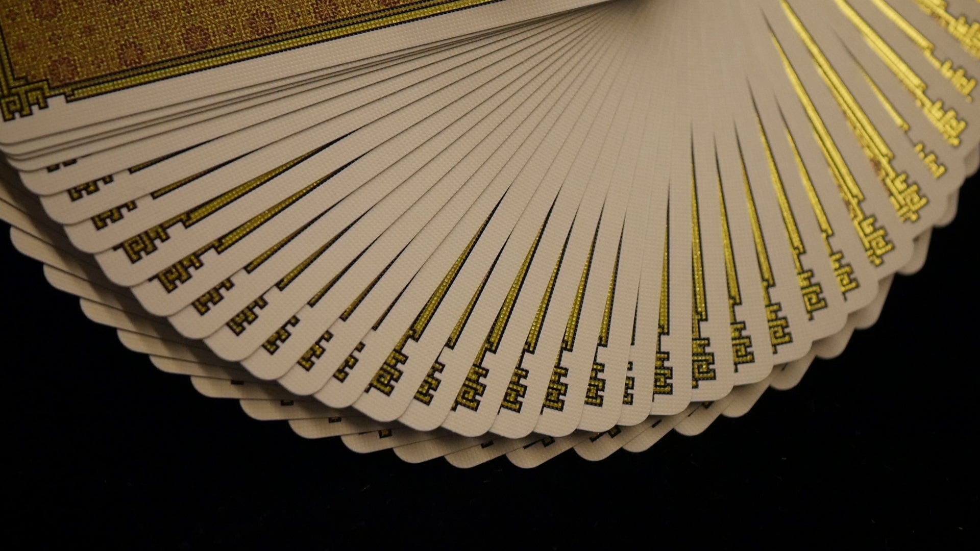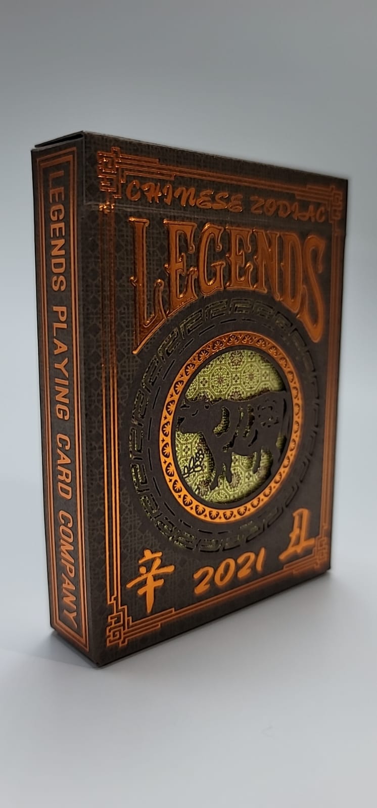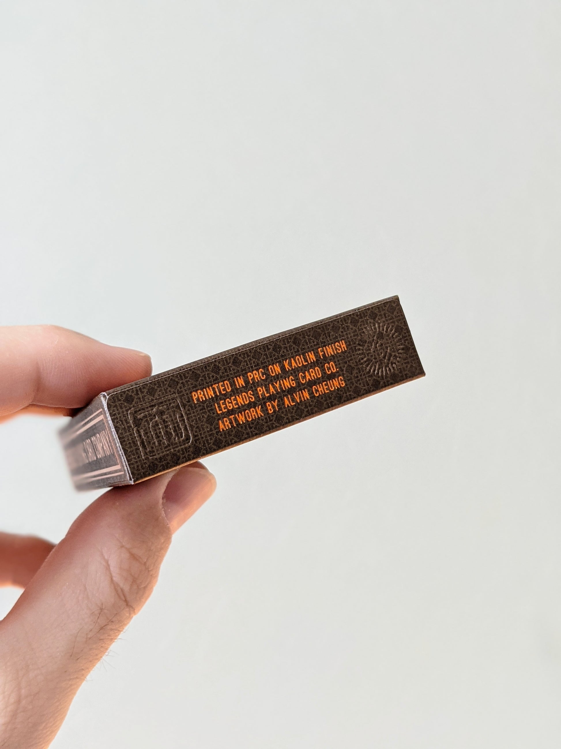 Uncoated brown tuck paper, which we printed a light pattern with metallic ink, followed by hot foil stamping and laser cutting, then packing and shrink wrapping with a gold tear strip. Overall, a luxurious feeling package with stunning technical feats never seen before in playing card production.