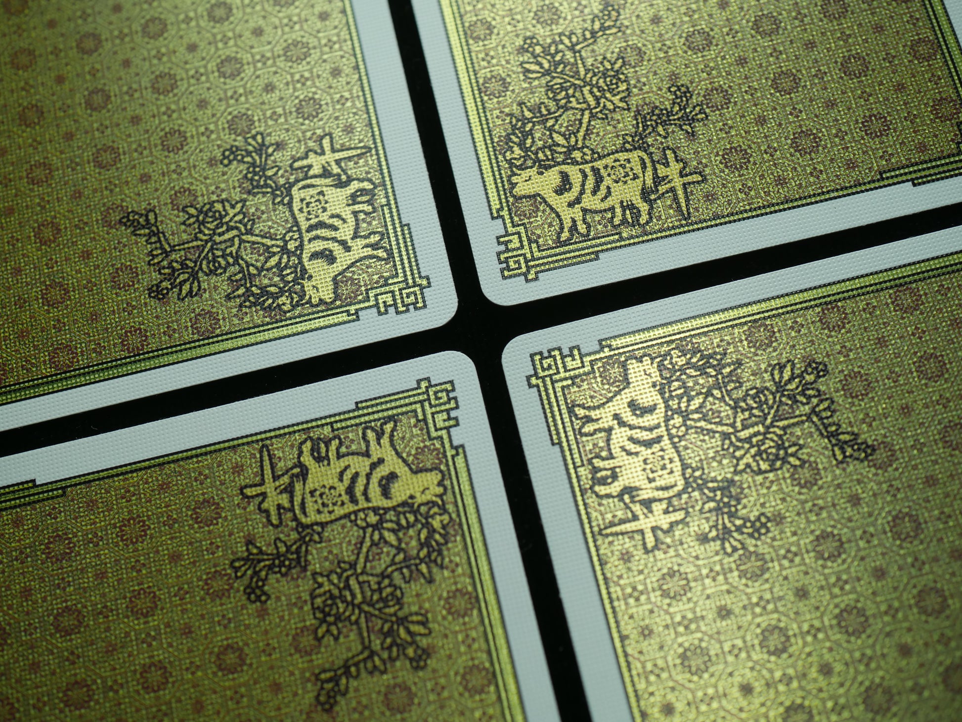 Cold foil card backs. Intricate and precise. Not as shiny as hot foiling or full-foil applications, but subtle and extremely accurate, for experienced deck designers.